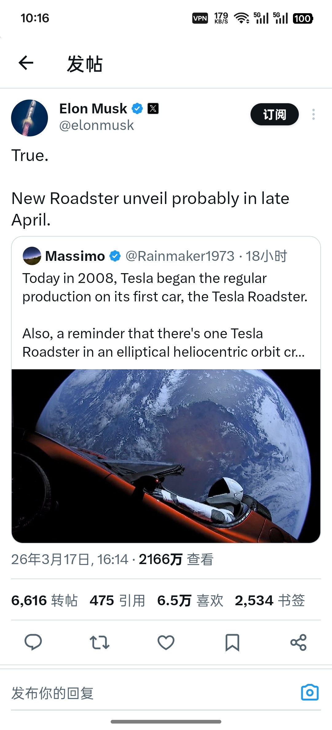 3月17日,特斯拉CEO马斯克在X平台宣布,超跑车型Roadster预计4月下旬发布。 (截图:X平台) 马斯克曾直言,购买法拉利的用户并不会把安全放在...