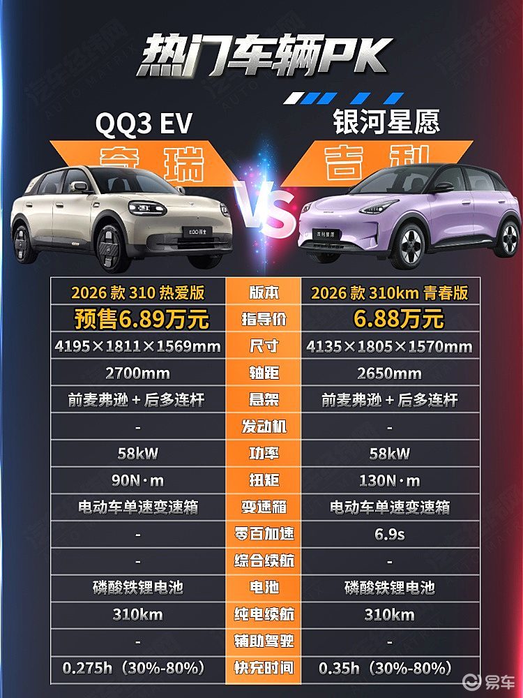 奇瑞QQ3 EV 2026款310热爱版售价为6.892万元,而吉利星愿2026款310km青春版售价为6.88万元,两款车的定位都是纯电小型代步车,售价比...