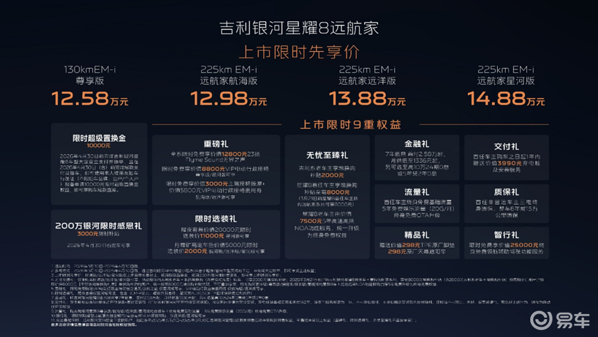 吉利银河星耀8远航家直击消费者购车痛点,全系搭载28.3kWh神盾金砖电池,CLTC纯电续航达225km…… 4月14日,2026款吉利银河星耀8远航家在...