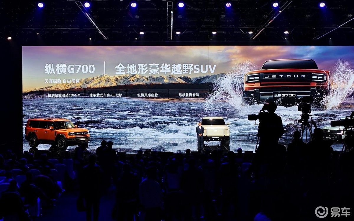 第一款车型是纵横G700。采用鲲鹏超能混动CDM-O,拥有非承载式车身+三把锁,纵横灵感座舱以及纵横乾崑智驾。从定位来看,纵横G700的定位是硬派越野SUV,而整体外观的视觉观感则和此前的捷途旅行者车系有所类似。