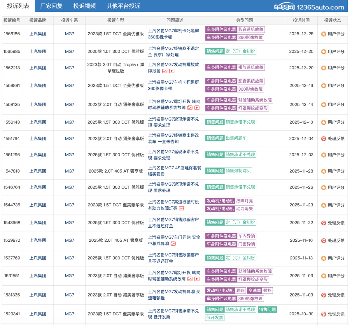 除了外部竞争,MG7还背负着来自老车主口碑的内部压力。在车质网等第三方投诉平台上,关于现款MG7的投诉虽不算海量,但反映的问题却较为集中和典型,主要集中在: