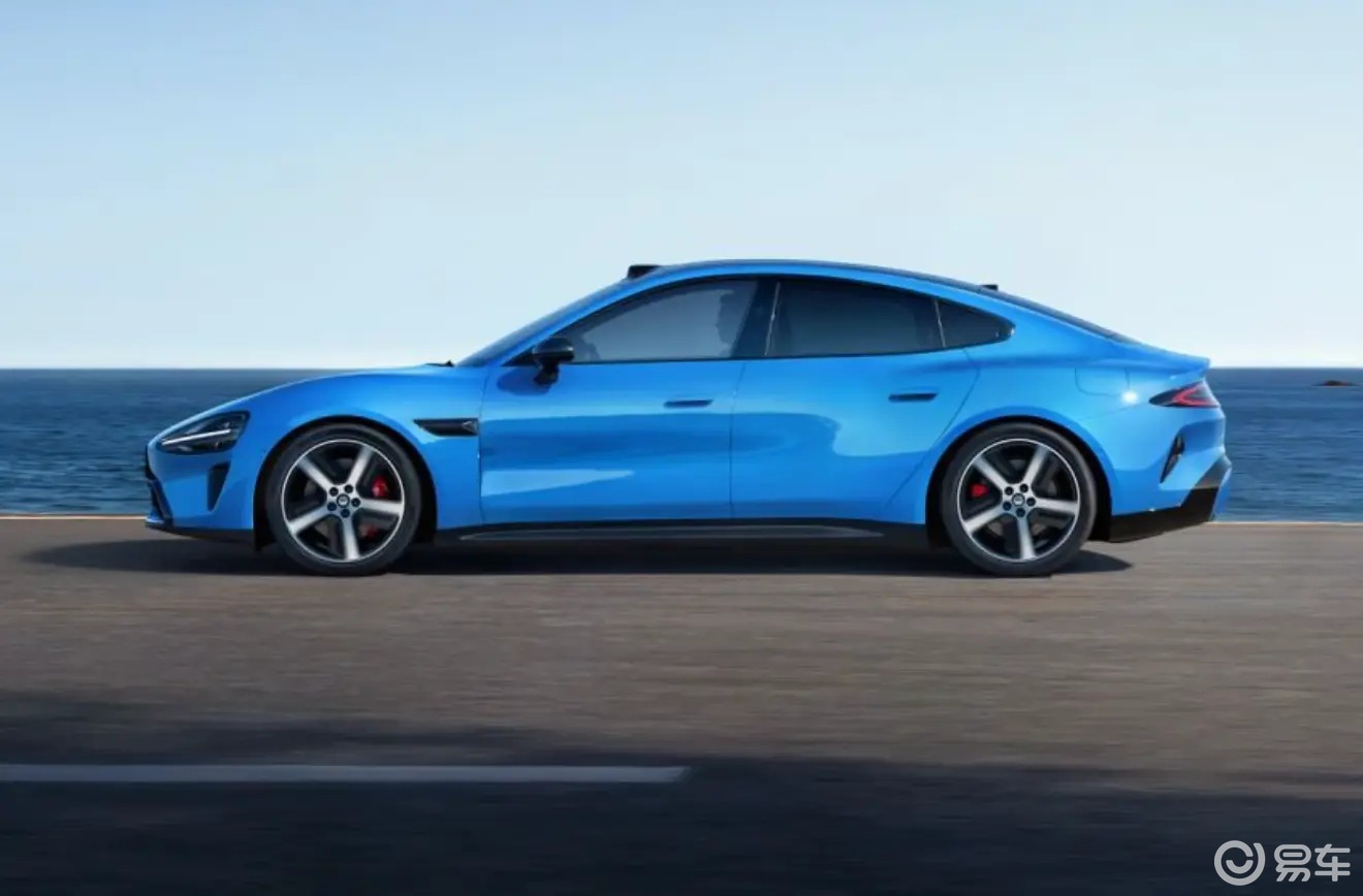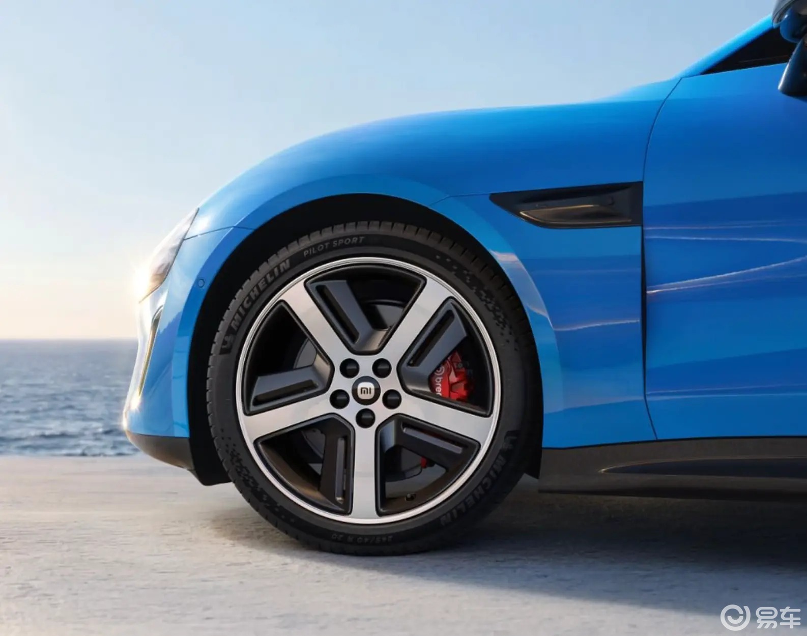 咱们先说说这外观,其实整体造型没大变,依旧是那个让人一眼就能认出来的米系轿跑范儿。不过这次新增了一个卡布里蓝的配色,再加上那个全新的20英寸铝合金轮辋,还有全系标配的前窄后宽轮胎,前轮245毫米,后轮265毫米,这一套组合,视觉上的力量感确实提升了不少。再加上黑色的外后视镜壳和红色的刹车卡钳,这种黑红蓝的撞色,年轻人的审美算是被小米拿捏了。