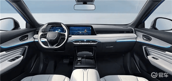 内饰配备一体式联屏屏与双色多功能方向盘,中控台通道区域采用拨杆式电子换挡机构。