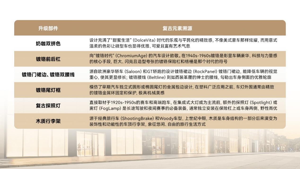 从产品层面看,“摩登马”并非换代或重大改款,而是在原有一汽奔腾小马基础上,增加了完整的设计套件。其“西西里假日”主题,通过独特的奶咖双拼色、大量镀铬装饰、复古探照灯和木质元素行李架,构建了一套完整的、具有辨识度的视觉体系。这套设计语言的目标非常明确:吸引那些对“方盒子”造型审美疲劳,对车辆“颜值”和“个性表达”有更高要求的新一代城市消费者,尤其是女性用户。这标志着部分车企开始将电车从“代步工具”向“时尚配饰”或“生活方式的延伸”进行价值重塑。