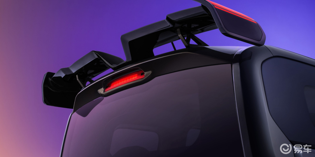 侧面,也是有这种大量的拉花设计,黑色轮圈也点缀了红色元素,细节拉满很有辨识度,尾部还给它装了一个很有个性的扰流板,有点复刻赛车设计的意思,不仅让整个车尾更有层次感,还把运动氛围直接拉满,总的看下来,整体造型很有视觉冲击力,而且足够有自己的特点,这外观真的很对年轻人的胃口。