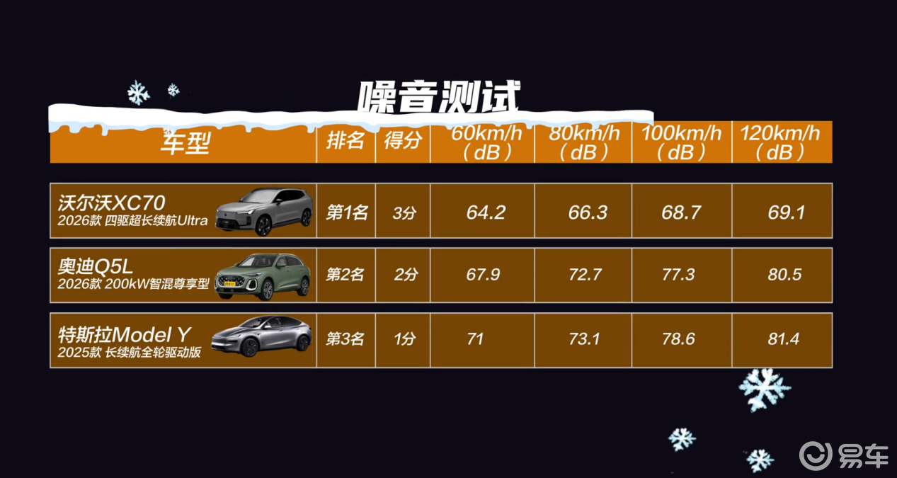然而在噪音测试中,全新XC70在60Km/h到120Km/h环境中,竟然全部优于Model Y这样的纯电动车,而Q5L的表现也很不错。这也说明,主流豪华品牌对于NVH的调校是更用心、更细腻的。