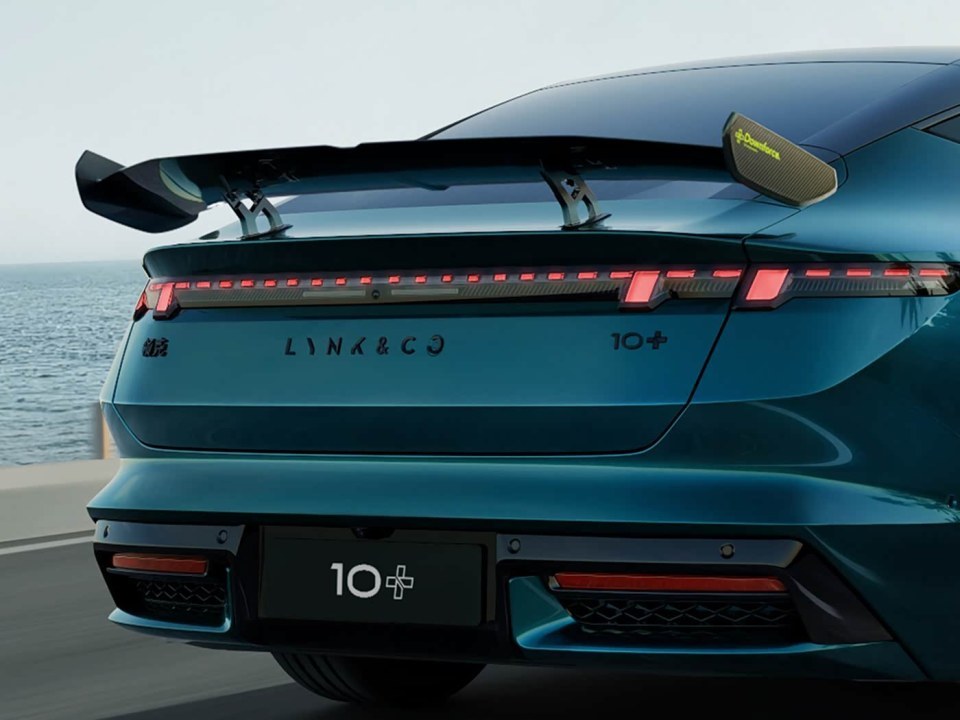 领克10+在外观上延续了领克家族的设计语言,但通过细节调整进一步强化了运动属性。车头部分采用封闭式格栅搭配H型灯组,前包围经过重新设计,三段式进气口和突出的前唇造型让车头看起来富有攻击性。车身侧面引人关注的是21英寸凌风锻造轮毂,搭配黄色高性能四活塞定钳,进一步提升了运动化的视觉感。车尾部分,可调碳纤维大尾翼是核心亮点,官方称行驶时可提供最高约109公斤的下压力,这对于高速行驶和过弯稳定性能带来实际提升。此外,专属的“赛影蓝”车色和车尾的“+”徽标,也进一步强化了性能版的辨识度。