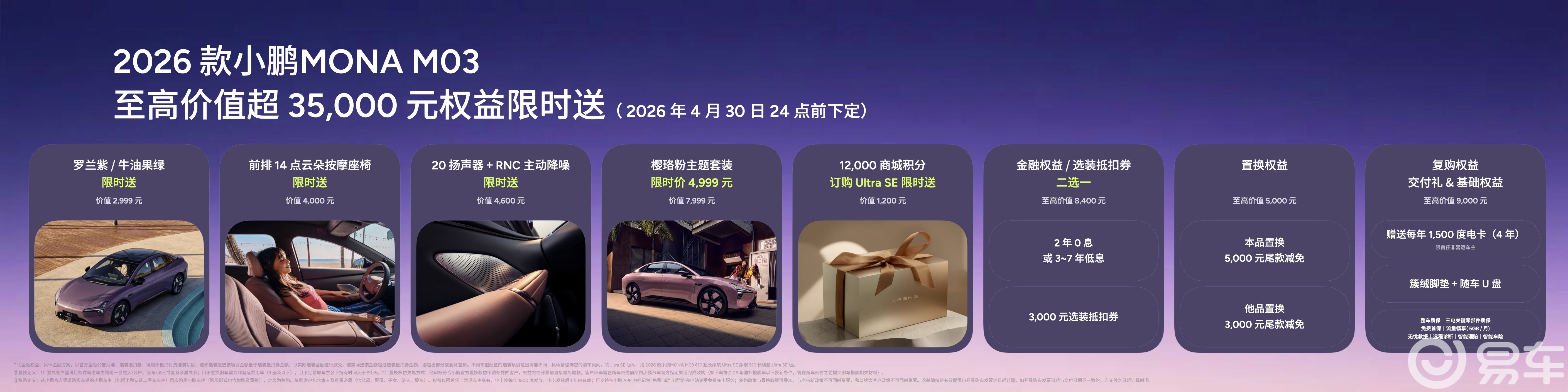 4月2日,小鹏汽车正式发售2026款MONA M03,6款配置车型官方指导价11.98万-15.18万元。即日起至4月30日下定,可享至高价值超35,000元专属权益