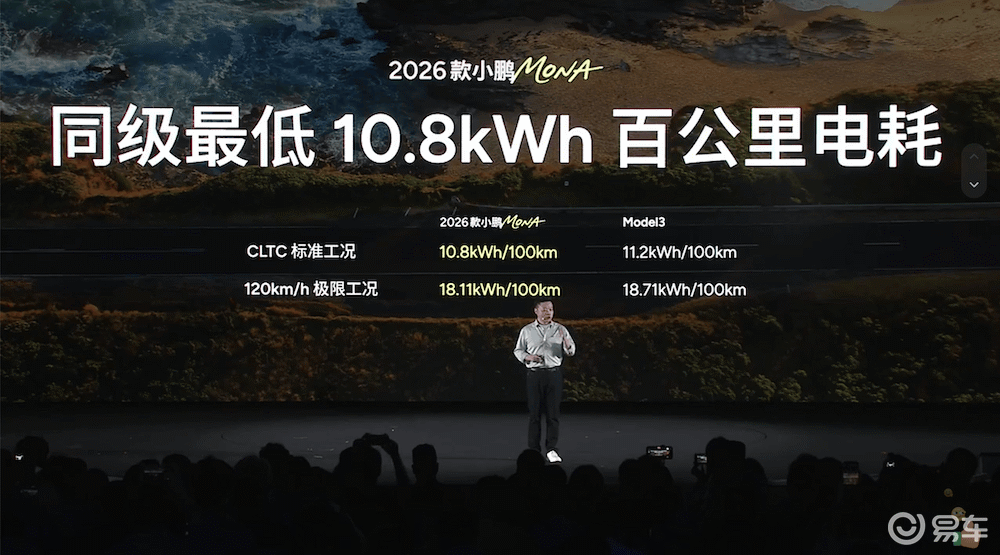 何小鹏也在现场介绍了2026款小鹏MONA M03的电耗表现,并晒出了和Model 3的电耗对比:2026款小鹏MONA M03 CLTC工况下百公里耗电量为10.8度,表现超过了Model 3。