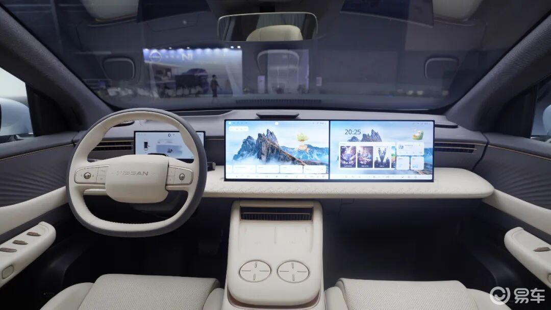 内饰方面,环抱式座舱,提供米白、雅黑两种内饰配色,256色光瀑式氛围灯与水波纹门饰板结合为一体,双辐式多功能方向盘搭配电子怀挡,前排配备10.25英寸仪表盘+双15.6英寸连屏设计+63英寸AR HUD抬头显示,内置NISSAN OS 2.0、高通8295P芯片、四音区智能语音。