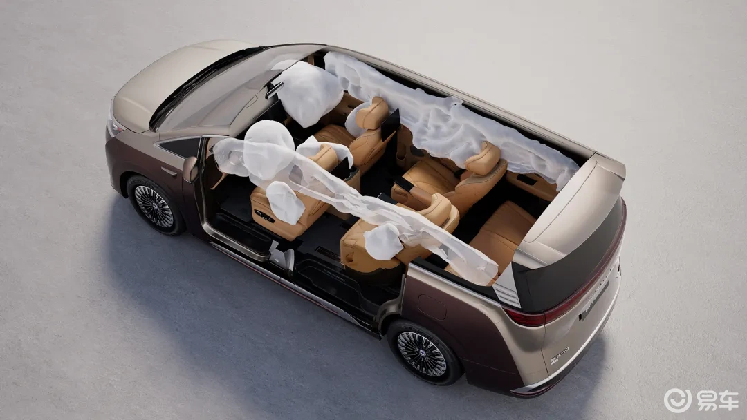 安全性能,超5星标准。车辆按超5星安全标准开发,车身高强度钢占比75%,采用2000兆帕级别热成型钢。全系标配9个安全气囊,配备同级较长的贯穿式侧气帘。搭载AEB自动紧急制动、AI避障、ESA紧急转向辅助等主动安全功能,同时具备高速爆胎稳定控制、横风稳定控制,并覆盖健康座舱与隐私安全,形成全维度防护。