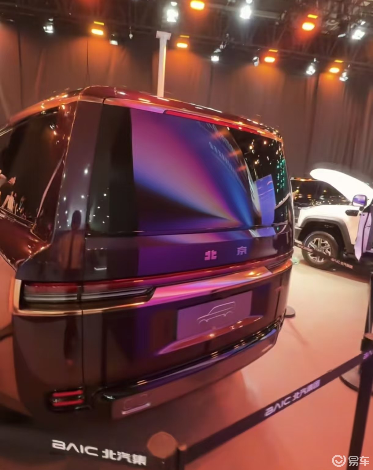 城市猎人的尾部方正立体,造型与路虎卫士有着明显不同,北京字标醒目,窄长的熏黑尾灯加入了金色装饰件或镀铬装饰件。