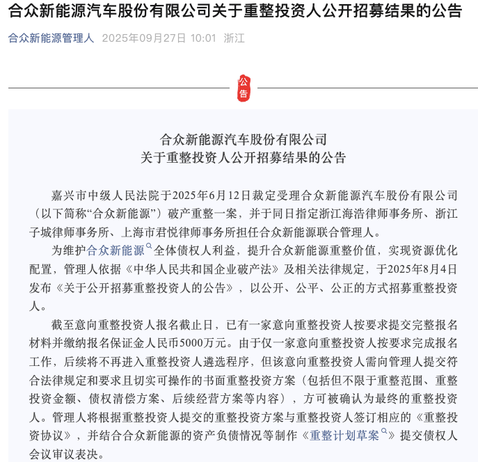 9月27日,合众新能源(哪吒汽车母公司)管理人通过微信公众号披露合众新能源重整投资人公开招募结果称,截至意向重整投资人报名截止日,已有一家意向重整投资人按要求提...