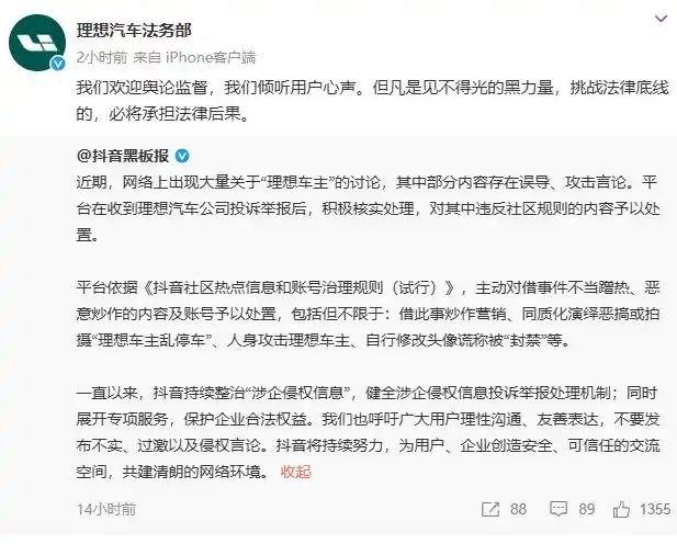 格隆汇8月13日|理想汽车法务部发文:“我们欢迎舆论监督,我们倾听用户心声。但凡是见不得光的黑力量,挑战法律底线的,必将承担法律后果。” 8月12日,抖音黑...
