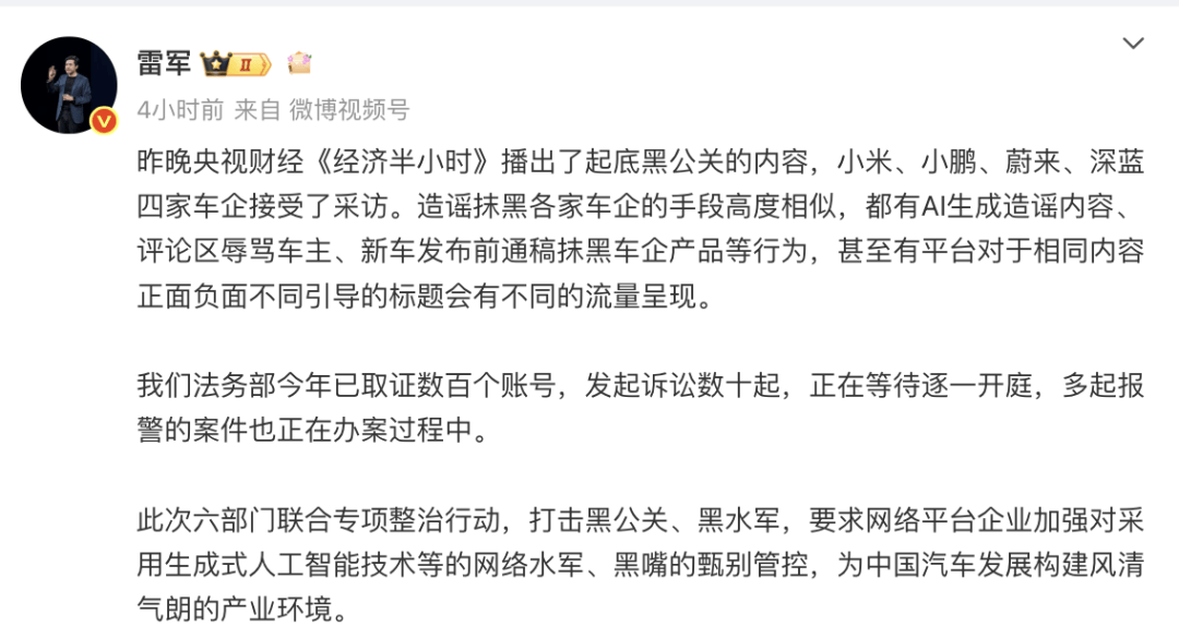 近日,央视财经播出了起底黑公关的内容,小米、小鹏、蔚来、深蓝四家车企接受了采访。9月13日,雷军发文表示,对于这类问题,法务部今年已取证数百个账号,发起诉讼数十...
