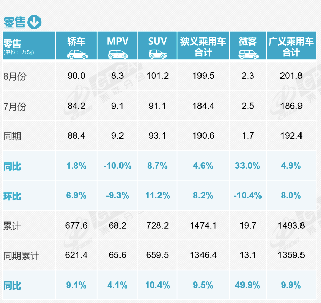 9月8日,乘联分会发布的最新数据显示,今年1~8月,全国乘用车市场累计零售销量为1474.1万辆,同比增长9.5%。其中,8月,全国乘用车市场零售销量为199....