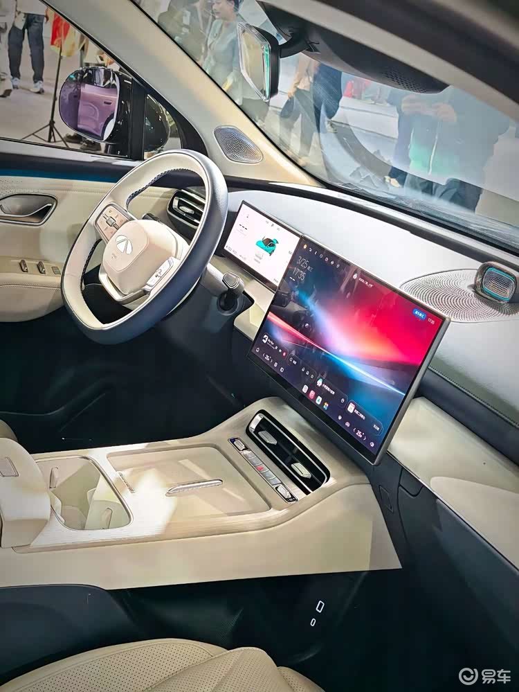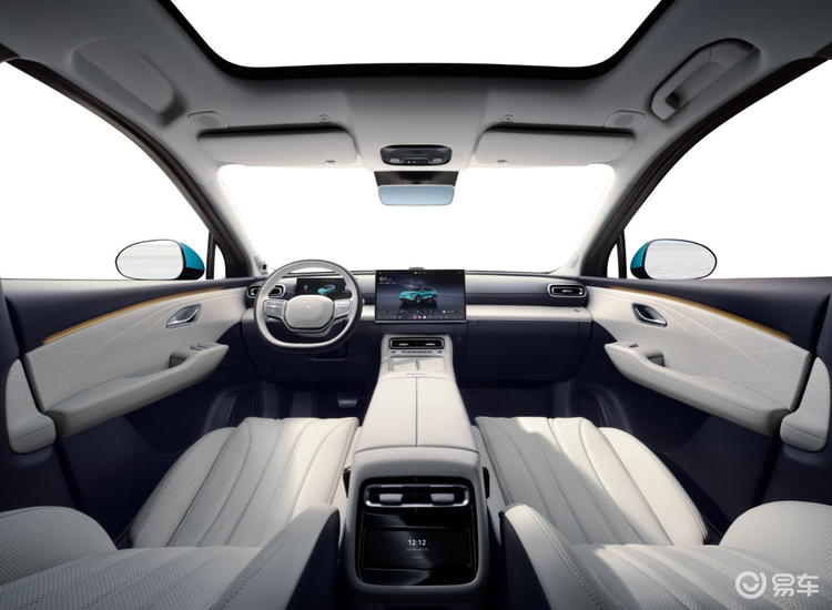 全液晶仪表盘以及双色双辐式多功能方向盘,中控台中间搭配17.3英寸的2.5K高清iMax屏幕,中控屏采用风云UI 2.0,可支持灵犀智能体,通道区域配备乐乐双出风口无线充电面板,横置双杯架设计。