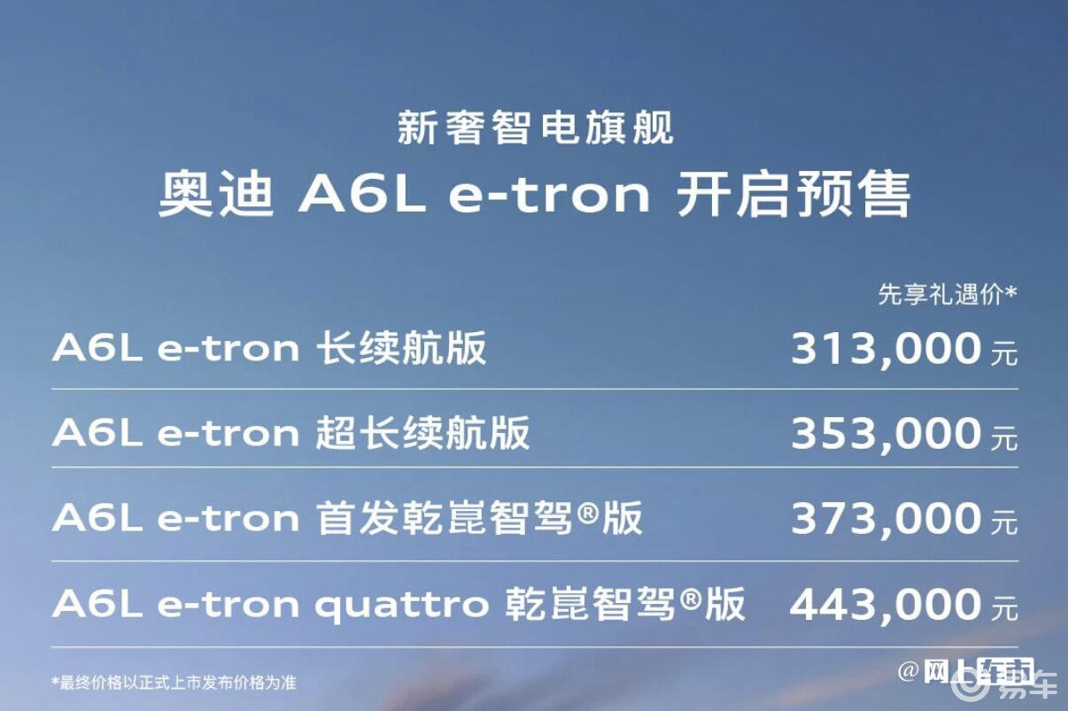 3月25号,全新A6L正式上市,还是预售那4款配置车型,每款都象征性的在预售价基础上下调了100元,售价区间32.29万元-43.59万元,入门版价格比我当时爆料的更便宜,顶配3.0T车型比宝马5系2.0T价格还低(全新A6L 3.0T车型指导价较上代降了10.5万元)。与此同时,A6L e-tron也开启预售,卖31.3万元起。